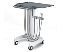 • 推车式不锈钢器械盘 1.推车式器械盘改善牙椅承载情况,使整机更稳定,消除器械臂给患者带来的压迫感。2.底部采用铝合金压铸工艺,提高结构稳定性,不变形、不生锈。